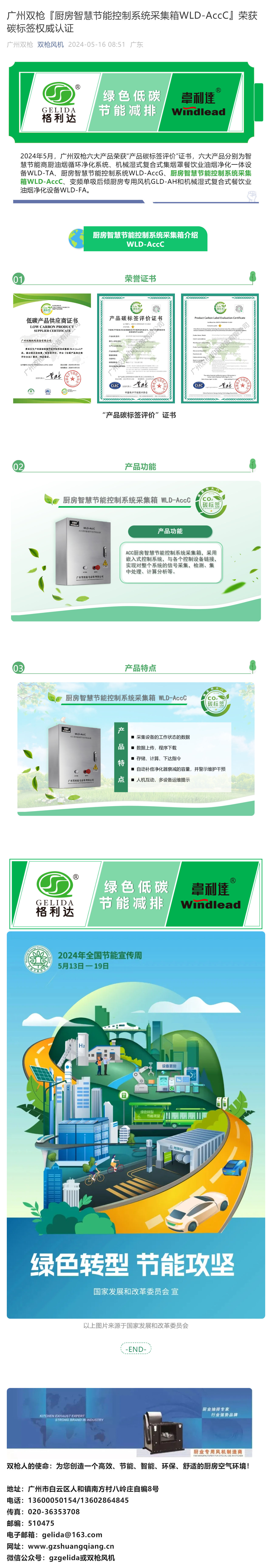广州双枪『厨房智慧节能控制系统采集箱WLD-AccC』荣获碳标签权威认证